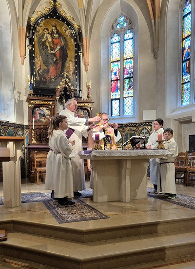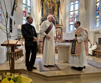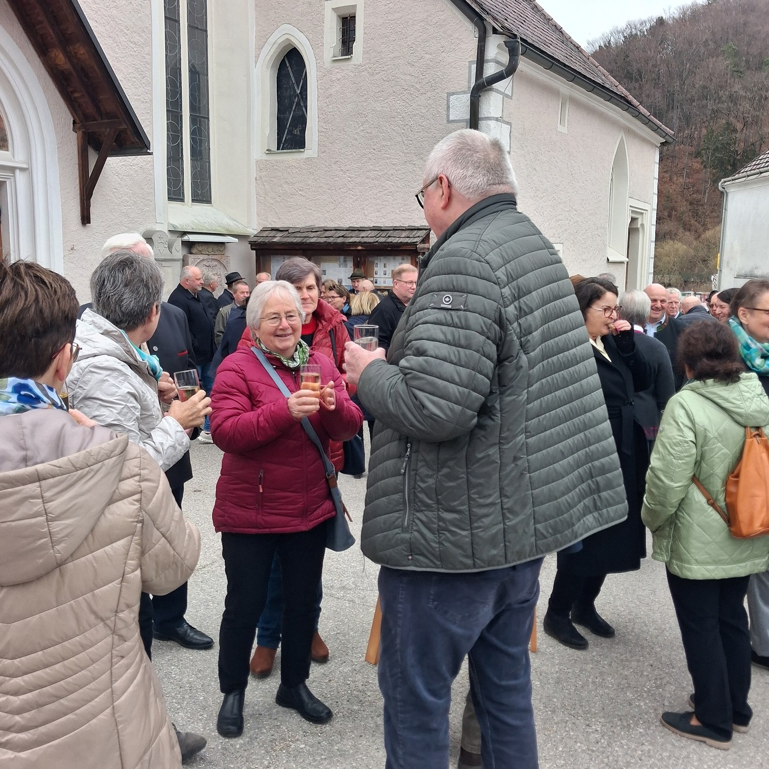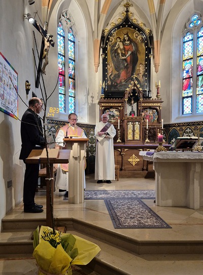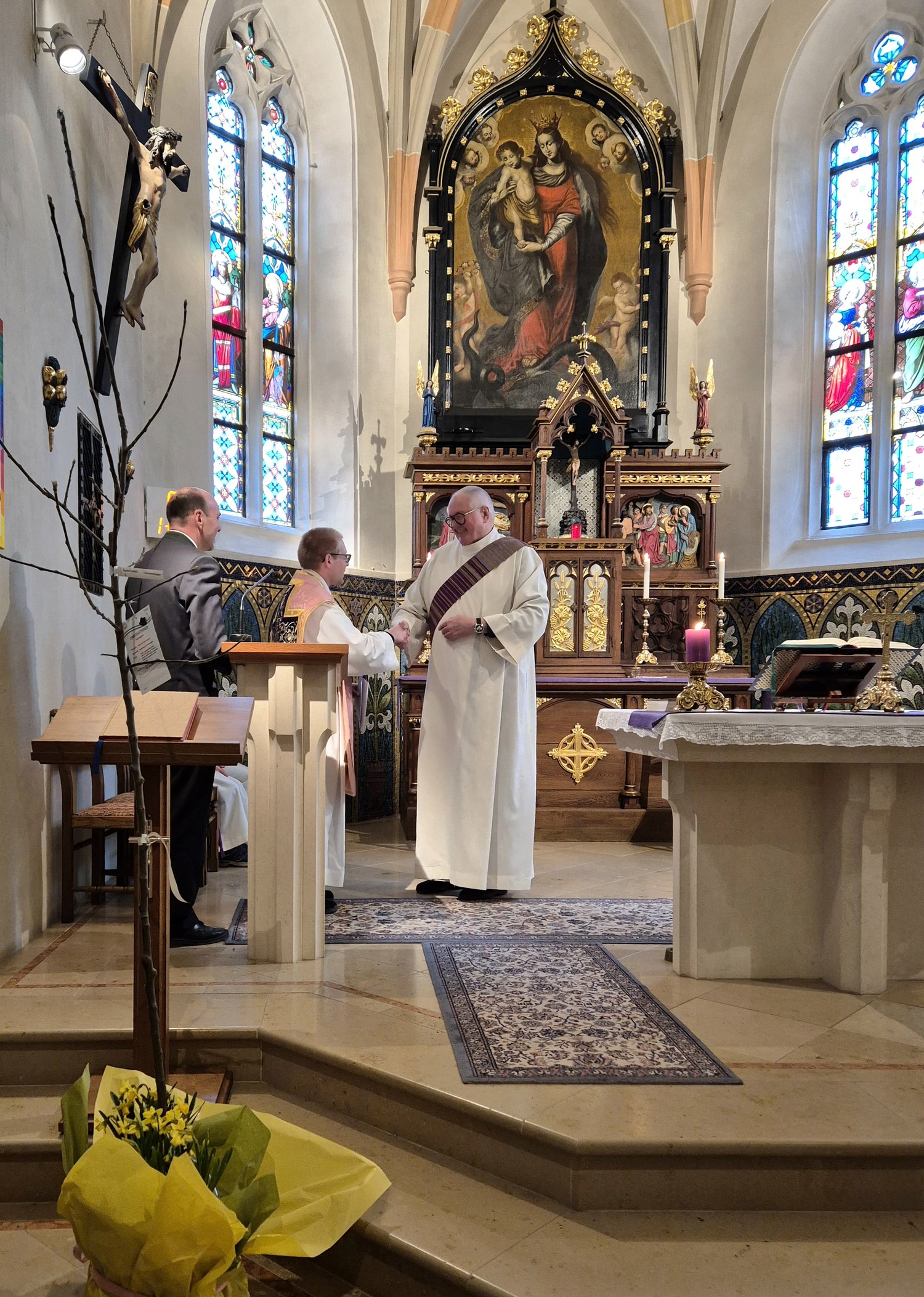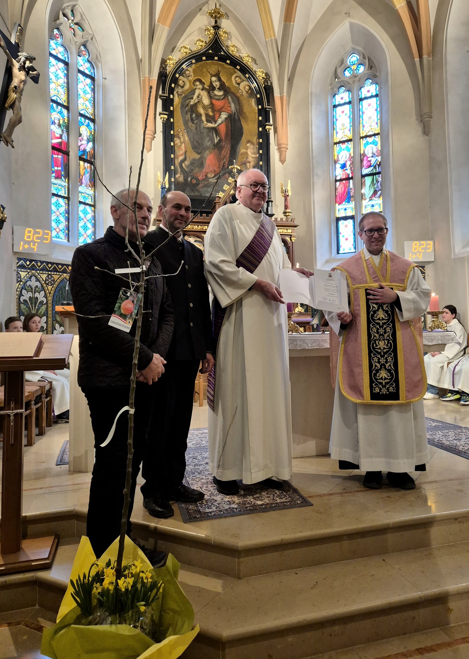 Der stv. Pfarrgemeinderatsobmann Erich Adelsberger leitet treffend mit den Worten von Psalm 1 ein, in dem es unter anderem heißt: „Wohl dem Mann, der nicht auf den Rat der Frevler folgt, nicht auf dem Weg der Sünder geht, nicht im Kreise der Spötter sitzt, sondern Freude hat an der Weisung des Herrn.“ Thomas Naske wurde im Oktober 2005 zum Diakon geweiht und ist seitdem in der Pfarre Randegg ehrenamtlich tätig. In seinem seelsorglichen Wirken nimmt er sich viel Zeit für die Assistenz bei Gottesdiensten, besonders auch bei Erstkommunionsfesten und Firmungen. Mit regelmäßigen Wortgottesfeiern überbrückt er, wenn Priester nicht alle gewohnten Messzeiten abdecken können. Zahlreiche Familien schätzen ihn als Taufspender. Viele Jahre organisiert er die Vorbereitungen von Firmungen und Firmspendern für eine jährliche Pfarrfirmung. Für die Gestaltung kind- und familiengerechter Gottesdienste hat er stets ein offenes Ohr und kreative Ideen. In den letzten zwei Jahrzehnten mit häufigem Priesterwechsel ist er der „stete Pflock“, der es für sich und Gottesdienstbesucherinnen und -besucher versteht, mit Übergängen und Aushilfen zurechtzukommen. Über das seelsorgliche Wirken hinaus, leistet er wertvolle Arbeit für die Öffentlichkeitsarbeit. Die Homepagegestaltung ist stets aktuell und das verlässliche monatliche Pfarrblatt für viele Menschen unverzichtbar. Pfarrmoderator Mag. Simon Eiginger überbringt Dankesworte von Diözesanbischof Alois Schwarz, der für dieses verdienstvolle Wirken ihm den Titel „Geistlicher Rat“ verleiht. Es ist das erste Mal, dass ein Diakon in der Diözese diesen Titel zugesprochen bekommt. Im Namen der Randegger Pfarrbevölkerung bedankt sich Erich Adelsberger. Passend zu Psalm 1,3, wo es heißt: „Er ist wie ein Baum, der an Wasserbächen gepflanzt ist, der zur Zeit seine Frucht bringt und dessen Blätter nicht welken. Alles, was er tut, wird ihm gut gelingen.“ überreicht er mit dem stv. PKR-Obmann Josef Tatzreither einen Apfelbaum. Bei einer Agape nach dem Gottesdienst konnten die Gottesdienstbesucherinnen und -besucher Diakon Thomas Naske persönlich gratulieren.